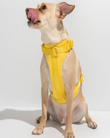 This Buttercup Yellow soft, stretchy, cushioned, lightweight harness is simple to put on and secure. It has an adjustable neck and chest for all shapes and sizes. What's clever is it has three leash attachment points because all of us with dogs like to hold our lead and walk them in different ways. Probably the smartest harness i've seen.