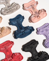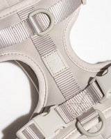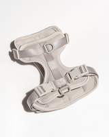This light grey soft, stretchy, cushioned, lightweight harness is simple to put on and secure. It has an adjustable neck and chest for all shapes and sizes. What's clever is it has three leash attachment points because all of us with dogs like to hold our lead and walk them in different ways. Probably the smartest harness i've seen.