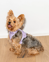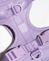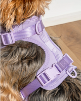 This Lilac soft, stretchy, cushioned, lightweight harness is simple to put on and secure. It has an adjustable neck and chest for all shapes and sizes. What's clever is it has three leash attachment points because all of us with dogs like to hold our lead and walk them in different ways. Probably the smartest harness i've seen.