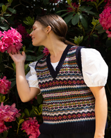 QUINTON CHADWICK FAIRISLE TANK IN NAVY WITH MULTI COLOURED PINK AND GREEN DETAILING