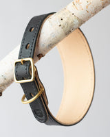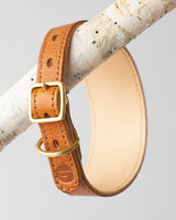 This collar goes through many stages, we hand cut the two leathers and burnish the edges. They are then stitched together and the hardware riveted. We then finish them with natural wax and our Barkened stamp.