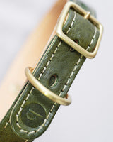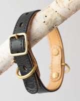 This collar goes through many stages, we hand cut the two leathers and burnish the edges. They are then stitched together and the hardware riveted. We then finish them with natural wax and our Barkened stamp.