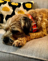We hand cut, burnish and rivet our dog collars, finishing them with natural wax and our Barkened stamp.