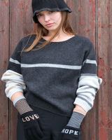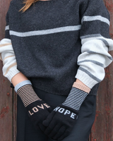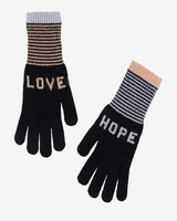This all new ,classic with a twist, knitted glove has the words LOVE and HOPE in Camel on one hand and Grey on the other. The stripe cuff detail also has a contrasting edge colour.
