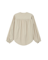 The SURI oversized blouse is crafted from 100% cotton corduroy, blending comfort with a retro touch. The long puff sleeves with buttoned cuffs add soft volume to the silhouette. The SURI corduroy blouse features gathering at the shoulders and back yoke.