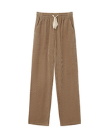 These taupe corduroy trousers are made of 100% cotton. The straight cut and elasticated waist give them a more comfort and a casual look they are a bit like corduroy track pants. These also have pockets on the sides and a drawstring at the waist.