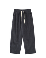 These anthracite grey corduroy trousers are made of 100% cotton. The straight cut and elasticated waist give them a more comfort and a casual look they are a bit like corduroy track pants. These also have pockets on the sides and a drawstring at the waist.