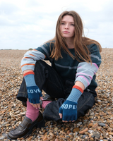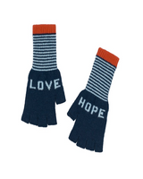 A teal fingerless knitted glove with the words LOVE and HOPE in aqua, a stripe cuff detail and a third colour tipping the edge.