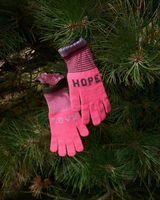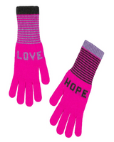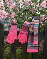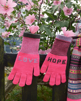 This all new, classic with a twist, knitted bright pink glove has the words LOVE and HOPE in berry on one hand, and parma violet on the other. The stripe cuff detail also has a contrasting edge colour.