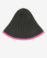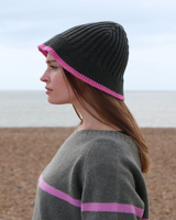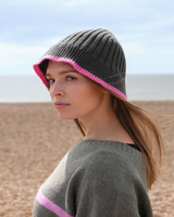 New design unstructured bucket hat is a pull on ribbed beanie style with a small floppy brim that is trimmed with a contrast colour.